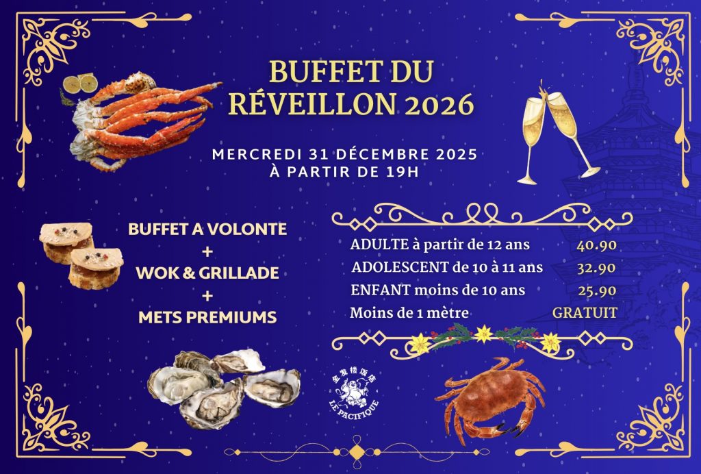 Le dîner commence à 19h et inclut seulement le repas, parfait pour vous laisser repartir le ventre remplis et continuer votre soirée festive ailleurs. Fruits de mer, foie gras, mets asiatiques, tout est préparés pour que vous puissiez profiter d’un repas gourmand en famille, en couple ou entre amis !